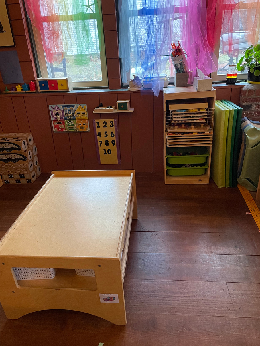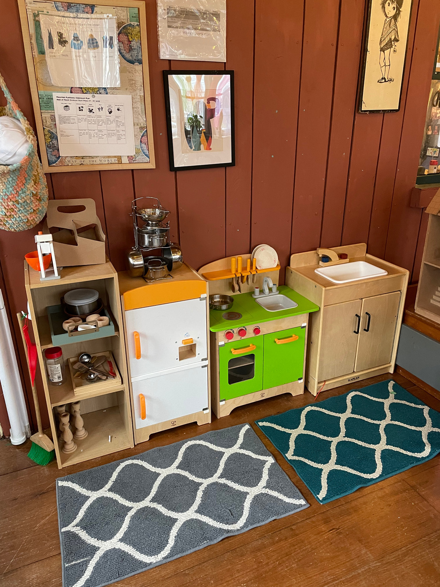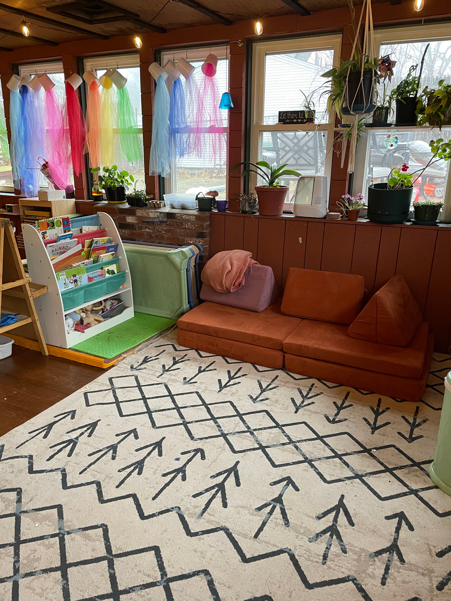 The play space is situated in a large enclosed porch with heat, air-conditioning, and ten windows that pick up the morning and mid-day sunshine. An air purifier, humidifier, and many plants keep the air clean throughout the day.